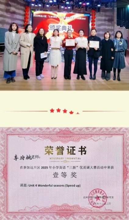 本网四川达州讯(杜靖宇 报道)捷报频传添喜色,教坛竞技展锋芒!12月3日,由达州市达川区教育教学研究室主办的2025年(下半年)“三新”课堂教学赛课活动圆满落幕。学校青年教师李汾桃凭借对教学理念的深刻领悟与扎实实践,在小学英语学科决赛中脱颖而出,成功斩获一等奖,为校园再添荣光。