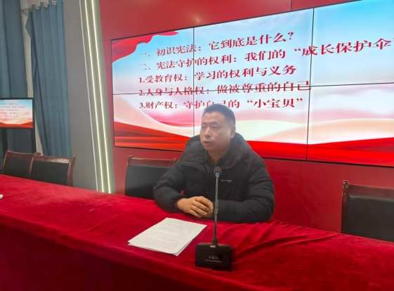 活动伊始,学校副校长姚朝忠通过精心准备的课件《初识宪法:它到底是什么?》,以浅显易懂的语言、生动形象的比喻,向同学们阐述了宪法作为国家根本大法的崇高地位和重要作用。讲解让同学们明白了,宪法并非遥不可及,而是如空气、阳光一般,时时刻刻陪伴并守护着每个人的成长,是我们生活中不可或缺的“成长保护伞”。