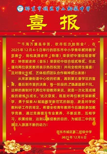 喜报中,城区二中号召全体青年教师积极投身教学竞赛,以赛促学、以赛促教,不断提升专业素养,为学校高质量发展注入持续动力。