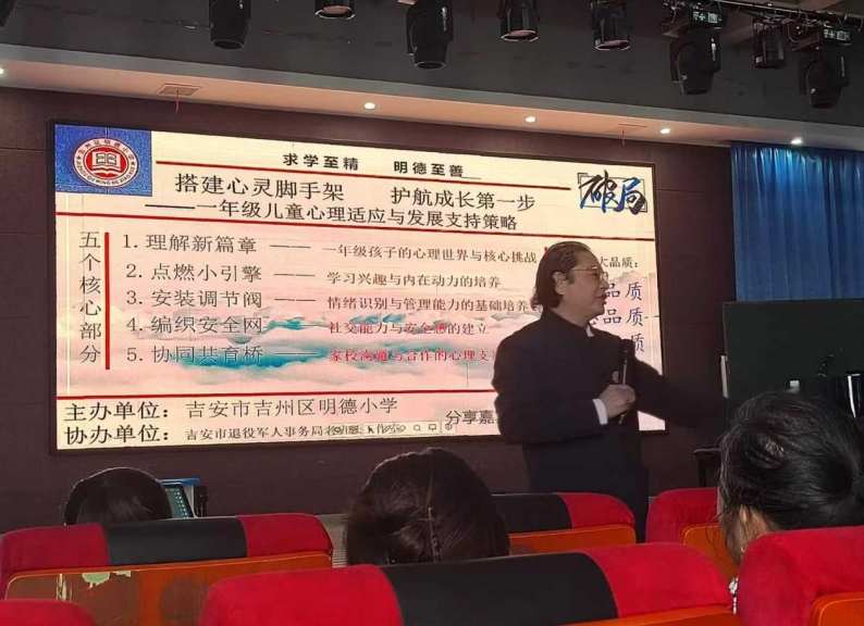 本网江西讯(陆威 黄洋)近日,江西省吉安市吉州区白塘中心小学联合吉安市退役军人事务局“老班长”工作室,开展了以“搭建心灵脚手架,护航成长第一步”为主题的一年级儿童心理适应与发展支持策略分享活动,特邀万训状专家团队进行主讲。