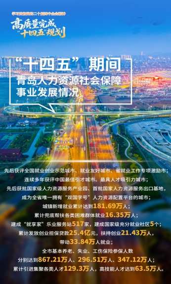 “十四五”时期,青岛市聚焦推动高质量发展和增进民生福祉,全力稳就业、促改革、惠民生,各项工作取得新进展新成效,为全市经济社会高质量发展提供坚实人力人才支撑。青岛市先后获评全国就业创业示范城市、就业友好城市、省就业工作专项激励市,“就享家”公共就业服务能力提升项目入选全国示范项目。入选全国首批工伤康复重点联系城市、全国社保经办数字化转型工作联系点城市、全国社保卡综合应用示范基地。连续多年获评中国最佳引才城市、最具人才吸引力城市。先后获批国家级人力资源服务产业园、首批国家人力资源服务出口基地,成为全省唯一拥有“双国字号”人力资源配置平台的城市。