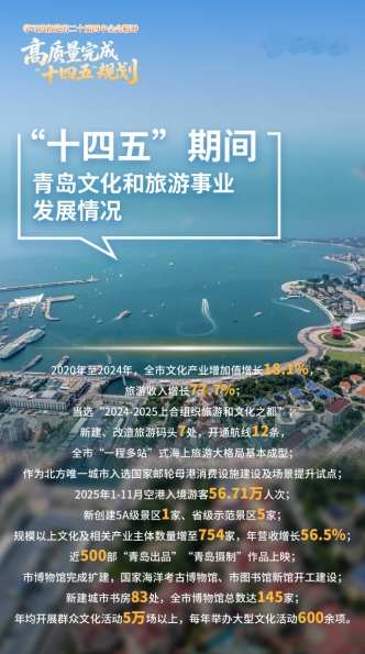 “十四五”时期,青岛聚焦文化强市、旅游强市建设,全力打造国际滨海旅游度假目的地。2020年至2024年,全市文化产业增加值增长18.1%,旅游收入增长77.7%,青岛入选首批国务院文旅产业工作激励城市、“中国十大旅游目的地必去城市”,当选“2024-2025上合组织旅游和文化之都”,连续三年跻身“全国游客满意度十佳城市”。