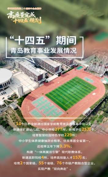 一是优质资源走近百姓“家门口”。让孩子们能够在家门口上好学,是青岛不懈追求的目标。实施基础教育优质资源倍增行动计划,持续扩大优质教育资源供给,努力推动“幼有优育”“学有优教”。五年来,新建改扩建幼儿园、中小学校277所,新增学位25万个,中小学集团化办学覆盖率达到90%。增加幼儿园公办学位4.5万个,公办园、优质园占比提升到66%、90%。全面落实学前一年免保教费政策,惠及9.5万名适龄幼儿。成立数字教育研究院,建设教育大数据中心,建成国家级智慧教育示范区2个,培育智慧校园特色学校229所。好学校离不开好老师,着力推进教师专业素养提升,近几年全市引进的国家公费师范生占到全省60%左右,全市拥有国家教学名师8人、全国模范教师和优秀教师94人、齐鲁名师名校长174人,居山东省前列。