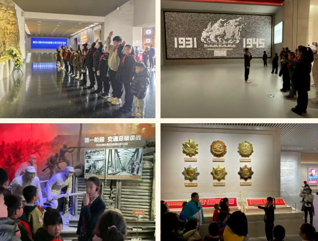 朗诵落幕,大家踏着积雪走进中国人民抗日战争纪念馆,开启沉浸式研学。入馆后,孩子们手持菊花,神情肃穆地缓缓献上,以最质朴的方式寄托对遇难同胞的深切哀悼与对革命先烈的崇高敬意。馆内文物、史料与复原展区,全景再现艰苦卓绝的抗战岁月,展现先辈以血肉之躯筑牢国防的壮阔征程。中国人民抗战纪念馆志愿讲解员、首都红色故事大赛小小金牌讲解员吴艾宸,为同学们解读抗战故事,让历史变得鲜活可触,引导大家深刻领悟筑牢安全防线的重要意义,强化家国担当。