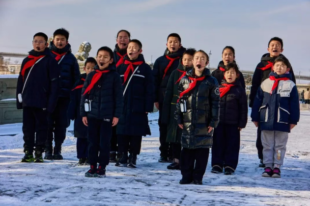 活动伊始,小小红色宣讲员们抵达卢沟桥。雪落青石板,斑驳弹痕在素白映衬下格外醒目,无声诉说烽火记忆;桥栏石狮身披薄雪,昂首挺立,见证民族不屈抗争。孩子们身着整齐着装,红领巾在白雪间格外鲜艳,齐声朗诵《我是卢沟桥》。稚嫩童声铿锵有力,饱含对先烈的缅怀与对历史的敬畏,更以少年之音践行全会精神,立下传承红色基因、守护家国和平的誓言,让国防意识悄然扎根。