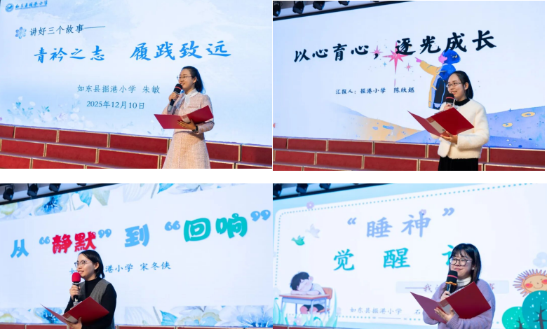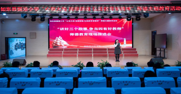 本网江苏讯(通讯员 叶亚均 李玲玲 陈丰 张一波)为扎实推进 "心有大我 培根铸魂 弘扬教育家精神" 师德主题教育,深化 "慧爱" 四有好教师团队建设,12 月 10 日,如东县掘港小学本年度第二场 "讲好三个故事 争当四有好教师" 师德教育现场推进会如期举行。学校全体教师与江苏省乡村义务教育领军校长培训百人计划的 11 名跟岗学员齐聚一堂,共赴这场以师德为核、以成长为翼的教育盛会。