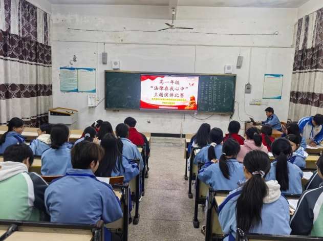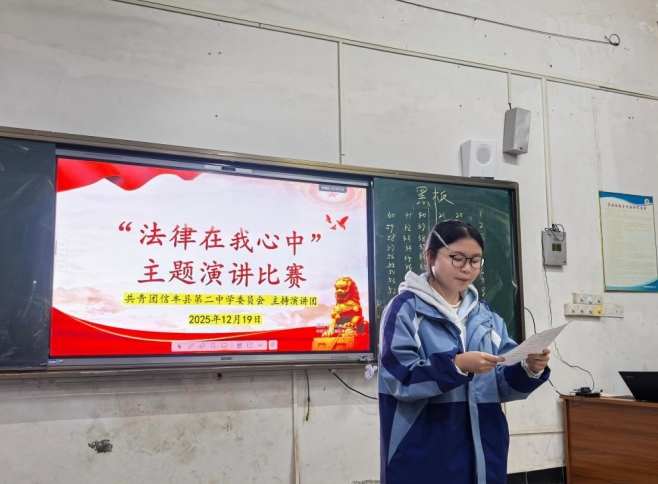 本网江西讯(邱顺飞)2025年12月19日晚,在静谧而专注的晚自习时段,由信丰二中团委主办、主持演讲团承办的“法律在我心中——以声传法,以言践德”主题演讲比赛在高一年级阶梯教室成功举行。本次活动不仅是主持演讲团一次重要的专业实践,更是继宪法知识竞赛后,学校“五个一”大德育活动在法治教育领域的深化与延伸,旨在通过语言的艺术,让法治精神真正浸润青年学子的心田。