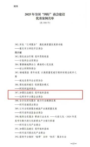 本网四川达州讯(杜靖宇 观理 报道)2025年12月22日,一则喜讯如春风般吹遍达州商界:中华全国工商业联合会正式发布《2025年全国“四好”商会建设优秀案例》,达州市中小微企业商会提交的《加强队伍建设,筑牢组织基础》案例成功入选。这一殊荣,不仅是对商会过去工作的肯定,更是对全体会员企业团结奋进、创新求变的见证。在此,我们谨向商会班子成员、全体同仁及会员企业致以最热烈的祝贺与最诚挚的敬意!