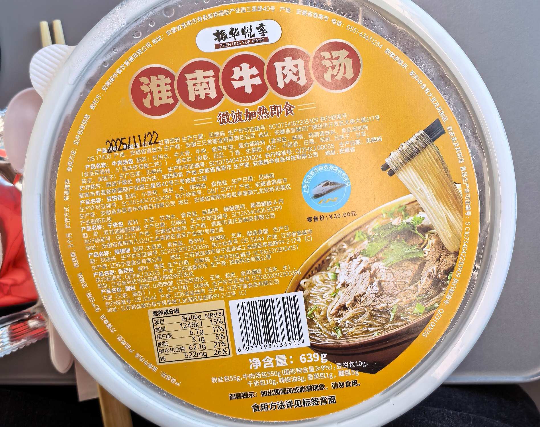 “汤里有金属丝。”我当即向途经收垃圾的工作人员反映。不到两分钟,一位女列车员迅速赶到,态度诚恳但难掩紧张:“这应该是生产过程中带入的,我们会向供应商‘淮南牛肉汤’反映。给您换一份还是退款?”