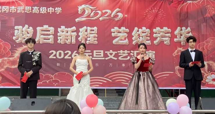 本网湖南讯(通讯员 周海成)校园是青春的沃土,艺术是成长的羽翼。为进一步丰富校园文生活,激发师生教与学的昂扬热情,培养学生艺术展演与鉴赏能力,2025年12月30日,湖南省武冈市武思中学校内彩旗飘扬、欢歌阵阵,以“骏启新程 艺绽芳华”为主题的2026年元旦文艺汇演隆重举行,全校师生齐聚一堂,用歌舞、朗诵、小品等多样形式迎接新年的到来。