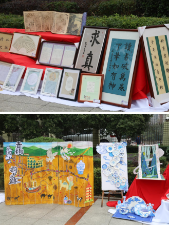 与此同时,室内外的作品展同样精彩纷呈。书法作品笔走龙蛇,篆隶楷行草各具韵味,书写着中华文字的千年魅力;手工展品巧夺天工,青铜纹样复刻、传统建筑模型、青花瓷 DIY 等作品,凝结着二小“艺术家”们对古代文化的理解与创意。每一件作品都成为诉说文明故事的载体,吸引着师生与家长驻足观赏、细细品味。