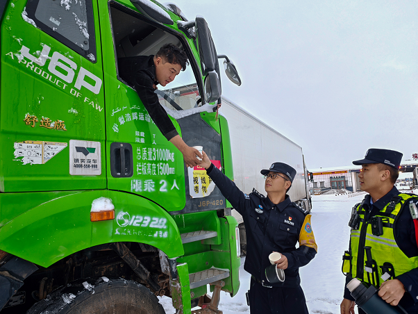 执勤民警第一时间加强路面巡逻,实时监测路况并提示驾驶员减速慢行。针对滞留的货车司机,民警冒着风雪将一杯杯热水送到他们手中,叮嘱大家注意保暖,同时告知驾驶员,遇到车辆故障、物资短缺等任何需求,可随时与检查站民警沟通。(通讯员:明懿)