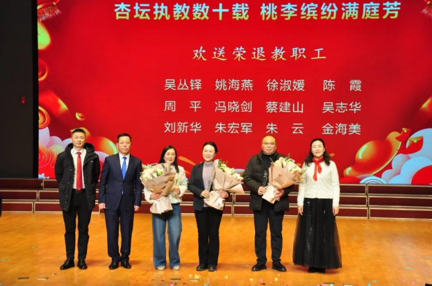 晚会的温情时刻,让团圆氛围愈发浓厚。学校为 12 位光荣退休的教职工送上鲜花与礼品,感谢他们数十年如一日在教育岗位上的默默坚守与无私奉献,致敬他们用青春与汗水浇灌桃李满庭芳;同时,为 47 位过整岁生日的老师举办了温馨的集体生日会,点点烛光映照着一张张幸福的笑脸,歌声与祝福声交织,传递着校园大家庭的关怀与温暖。