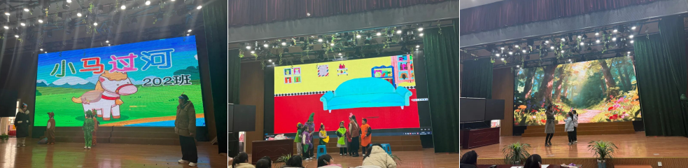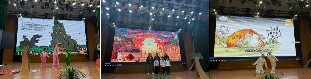 寓言故事与童话经典的演绎同样精彩纷呈。103 班亲子家庭联袂呈现《守株待兔》,将农夫心存侥幸、不劳而获的形象刻画得入木三分,让观众在欢笑中领悟 “脚踏实地方有收获” 的人生哲理;104 班的小表演者们化身可爱的 “三只小猪”,用智慧与团结成功抵御 “大灰狼” 的侵袭,生动诠释了 “团结就是力量” 的真谛。