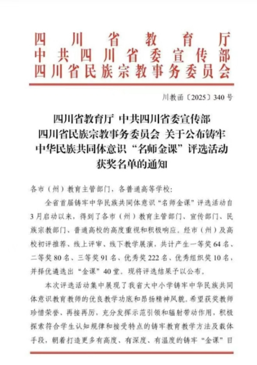 本网四川达州讯(杜靖宇 观理 报道)近日,由四川省教育厅、省委宣传部、省民族宗教事务委员会联合举办的全省首届铸牢中华民族共同体意识“名师金课”评选活动圆满落幕。本次活动汇聚全省大中小学教师优秀课例,经层层遴选,达州市达川区逸夫小学青年教师符桂林执教课例荣获优秀奖。
