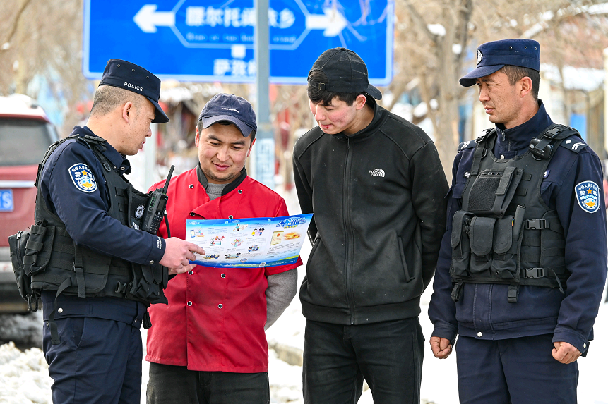 1月8日,新疆出入境边防检查总站克州边境管理支队膘尔托考依边境派出所民警走进辖区开展“守住钱袋子,护好幸福家”主题反诈宣传活动。
