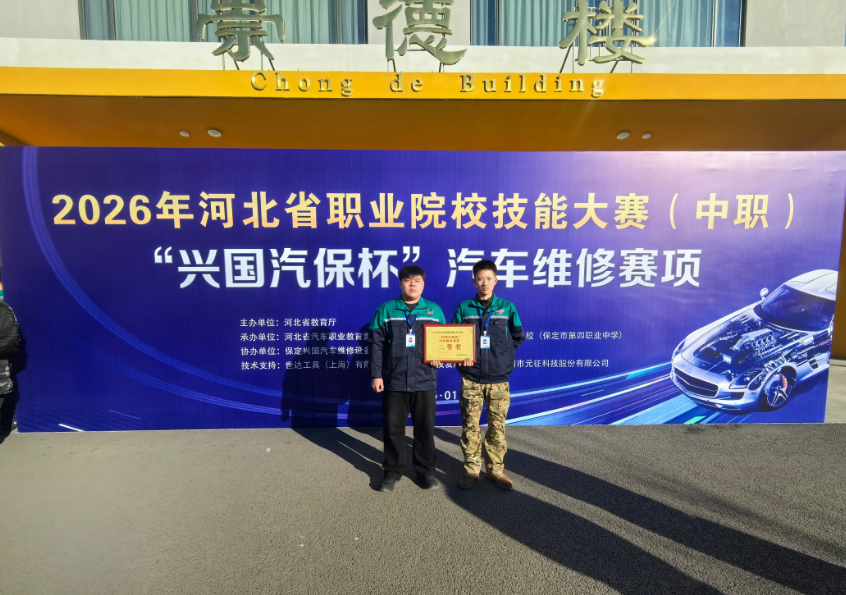近日,由河北省教育厅主办的2026年河北省职业院校技能大赛(中职)“兴国汽保”杯汽车维修赛项圆满落幕。北方机电工业学校汽车与地质工程系学生陈成奥、王宁凭借扎实的专业功底、默契的团队协作和出色的现场应变能力,在全省70支代表队的激烈角逐中脱颖而出,荣获团体二等奖。