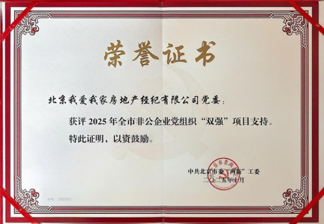 近日,我爱我家集团党建品牌“爱家星行动”入选2025年北京市非公有制企业党组织“党建强、发展强”项目支持名单,该项目由北京市委“两新”工委组织,是全市非公企业党建工作先进典型选树的重要平台。凭借着党建引领企业发展、赋能基层治理、践行社会责任等方面的扎实实践与突出成效,我爱我家成为今年唯一入选“双强”项目的房地产经纪企业。