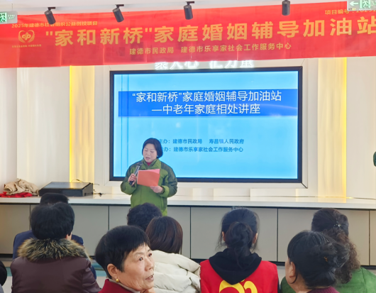 近日,在建德市民政局指导、寿昌镇人民政府支持下,建德市乐享家社会工作服务中心依托“家和新桥家庭婚姻辅导加油站”,同步开展中老年家庭相处讲座与寿昌志愿服务队年度总结展望活动,政企社多方代表齐聚一堂。