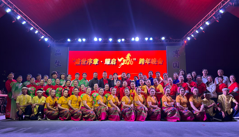 乐舞迎新展风采,银龄激情绽舞台。12月31日,县老年大学31名师生受邀参加勐腊县2026跨年晚会。艺术团师生先后献上器乐合奏《花好月圆》《喜洋洋》以及舞蹈《万疆》,以悠扬的旋律和优美的舞姿营造出喜庆祥和的节日氛围,展现出老年学员昂扬的精神风貌和扎实的艺术素养,赢得现场观众阵阵掌声。