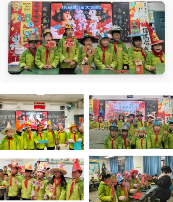 音乐舞台童声嘹亮,一年级“追风小百灵,踏歌跃马行”歌声整齐、节奏稳定,展现音乐感知力与协作意识;二年级“小马歌谣大冒险”抽签完成猜歌名、节奏模仿或演唱挑战,在互动中提升乐感、锻炼反应、增强默契,充分体现音乐学习的趣味性与实践性。