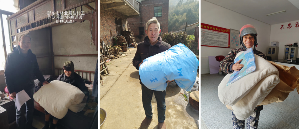 为应对寒潮,市林业局驻村工作队准备在驻在村皇帝岭林场观音村开展“寒冬送温暖”活动,并对全村困难群众御寒需求进行了摸排,提前汇报并得到局领导的高度重视,市林业局从应急管理局部门争取了专项救灾物资。从2026年 1月22日开始,驻村工作队陆续将15床棉被和5件防寒大衣发放到该村特困户、五保户、监测户等困难群众手中。在走访中,工作队队员与群众亲切交谈,详细询问其身体状况和过冬安排,并反复叮嘱注意防寒保暖及用火用电安全,确保平安过冬。