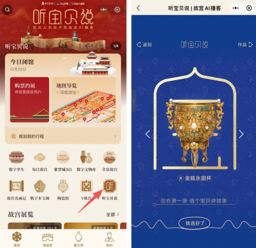 12月29日,“听宝贝说”AI互动播客正式上线,用户可通过“故宫博物院”微信小程序体验。该播客精选30件院藏珍贵文物,依托豆包大模型等AI技术,用户只需简单跟读指定语句,即可生成个人音色的文物讲解视频,收听生动有趣的文物故事。该播客由故宫博物院与火山引擎联合推出,即日起至2026年3月31日开放体验。