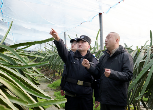 离园区不远的佳盛农场,火龙果大棚在冬日阳光下泛着暖光。大棚内温度适宜,“新农人”崔海川站在地头,把前来走访的民警连峰、辅警冯郎迎进大棚。连峰问到:“老崔,最近轻松点了吧,能休息好了吧。”