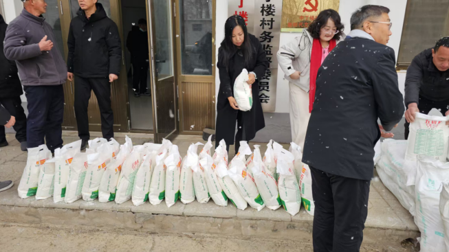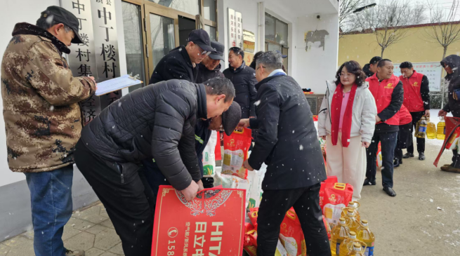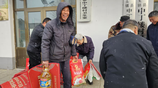“今天下着雪,没想到咱政府和爱心组织还是如约将慰问品送到了我们手中,这些米面油都是我们过年所需要的,还有春联、地垫等物品,这样的慰问太接地气了,感谢他们……”。领到慰问品的老党员张建学激动的说。