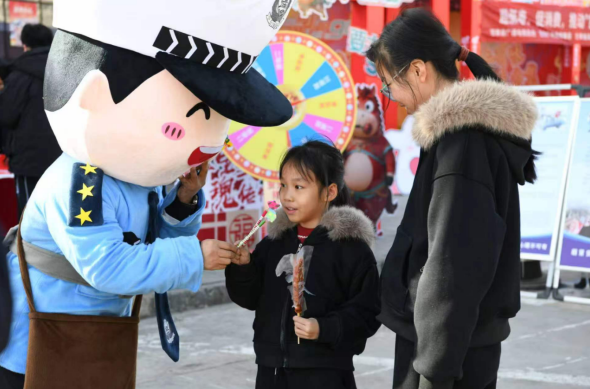 现场最引人注目的当属“平安年货铺”,司乘人员参与交通安全知识问答或现场作出安全承诺,即可获得春联、福字及定制交通安全宣传品,通过寓教于乐的互动,有效传递安全出行理念。