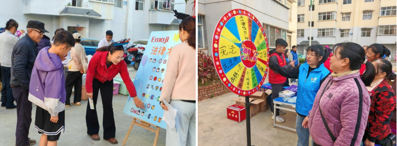 法治宣传互动区实现教育性与趣味性的有机统一。勐海县司法局工作人员在党总支协调下,创新设置表情猜猜猜(法律术语)和法律常识猜谜语两项趣味游戏,通过生动形象的表情符号、趣味谜面,将民法典、反诈知识、未成年人保护等法律知识融入其中,居民们积极思考、踊跃抢答,在轻松愉快的氛围中学习法律知识,在互动体验中增强法治观念,真正实现了“玩中学、学中乐”。同时,党员志愿者在现场还设置普法转盘游戏,进一步丰富普法形式,让法治理念深入人心。