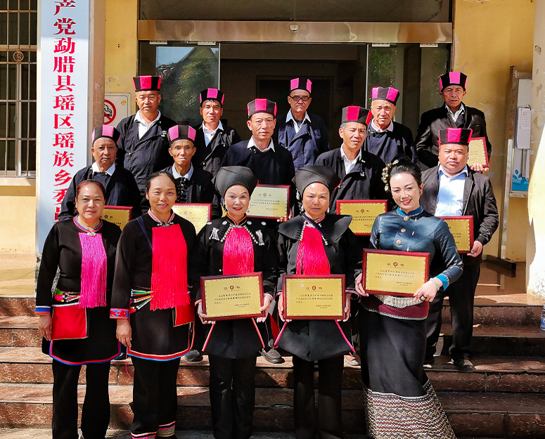 培训期间开展研讨交流环节,强调以“四个自信”激励传承人坚守初心、勇担使命,持续增强非遗人才队伍的荣誉感与责任感。在乡人民政府门前,乡党委、政府庄重举行非遗传承人证书颁发仪式,身着传统瑶族服饰的银发导师与青年学员手持证书合影,仪式感浓厚,充分体现地方党委政府对非遗保护的高度重视。通过此次活动,进一步强化了群众对民族文化身份的认同和对“银发技艺人才”作用发挥的认可,凝聚起全社会共同守护民族根脉、增强文化自信的广泛共识。