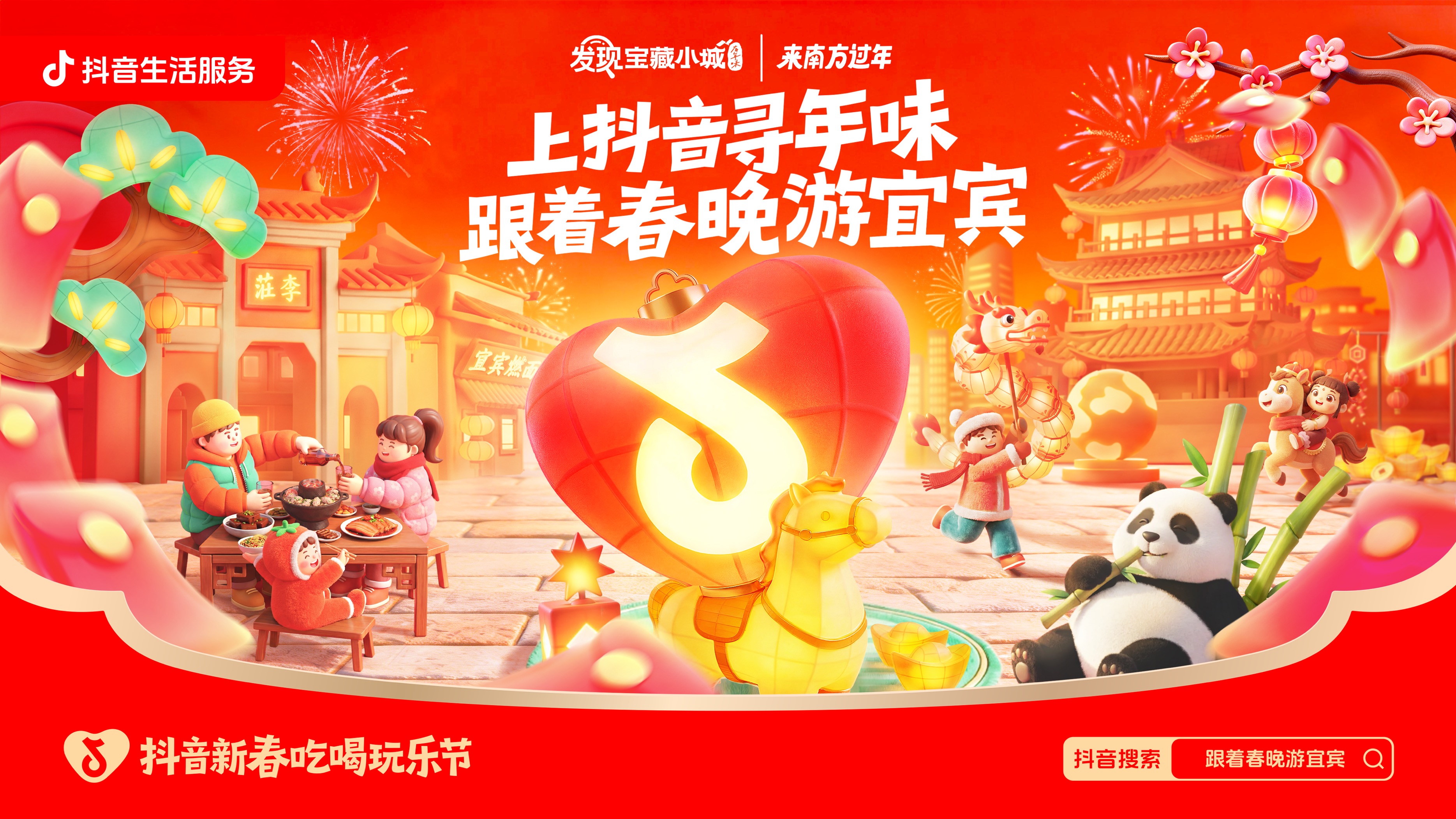 为了让这份热闹不只停留在春晚直播中,抖音生活服务联动央视总台春晚分会场宜宾,落地「跟着春晚游宜宾」活动,联动「抖音新春吃喝玩乐节」「发现宝藏小城」「来南方过年」三大IP,想把天南地北的你们请进来,尝美食、看美景、赏非遗,过一个原汁原味的春晚同款中国年。