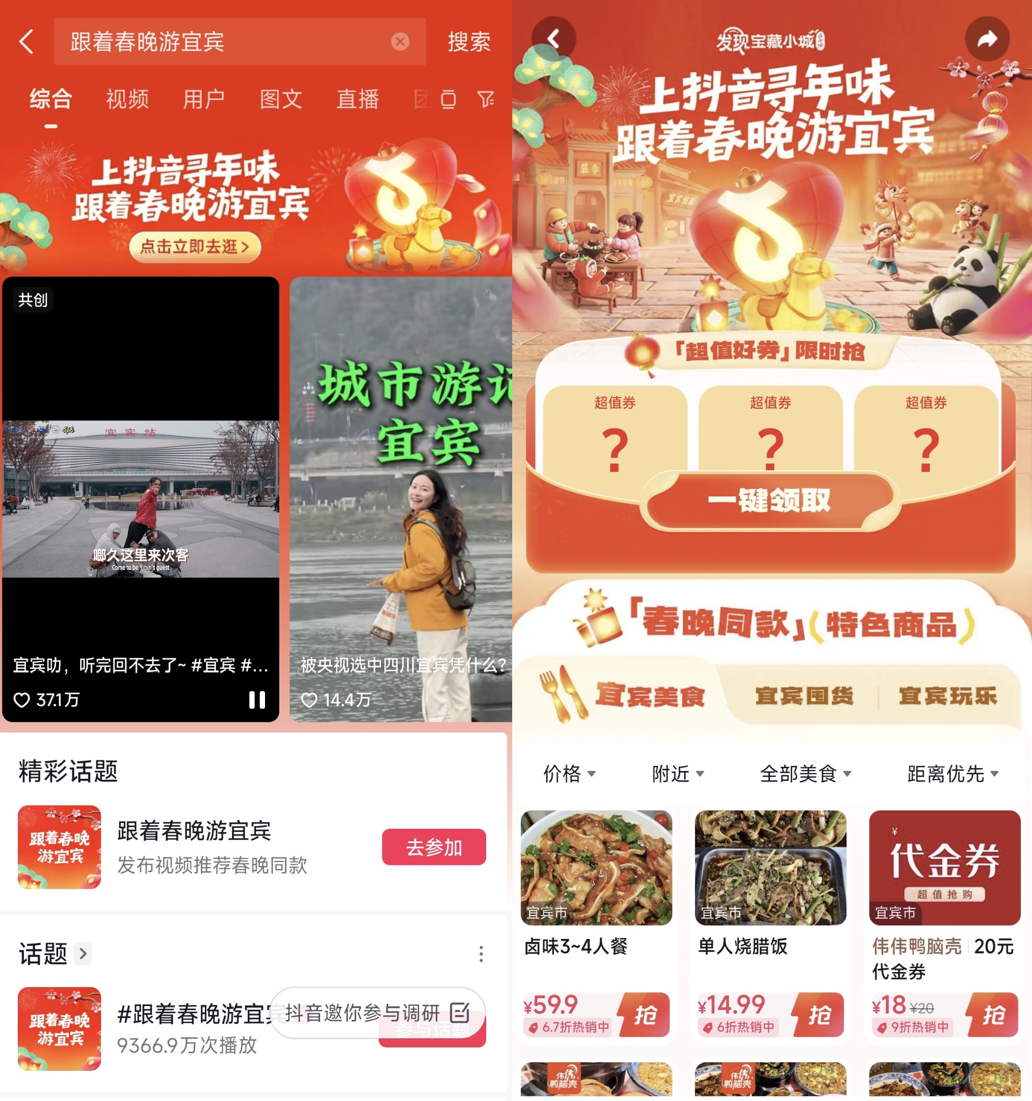 万里长江在此启程,千年古镇在此守岁。宜宾全城商家也备好了年味盛宴。搜索#跟着春晚游宜宾,进入活动主会场,即可直达吃喝玩乐的优惠套餐,到店核销可享好礼,只等你来。畅游宜宾之余,不妨带话题#跟着春晚游宜宾,晒出你的独家过年路线——把吃到的美食、看过的美景和遇见的惊喜统统分享出来,还有机会赢取现金奖励和文旅消费券,和千万人一起,过个热热闹闹的宜宾年。