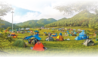 丰都天湖草场露营基地,彩色帐篷点缀其间。