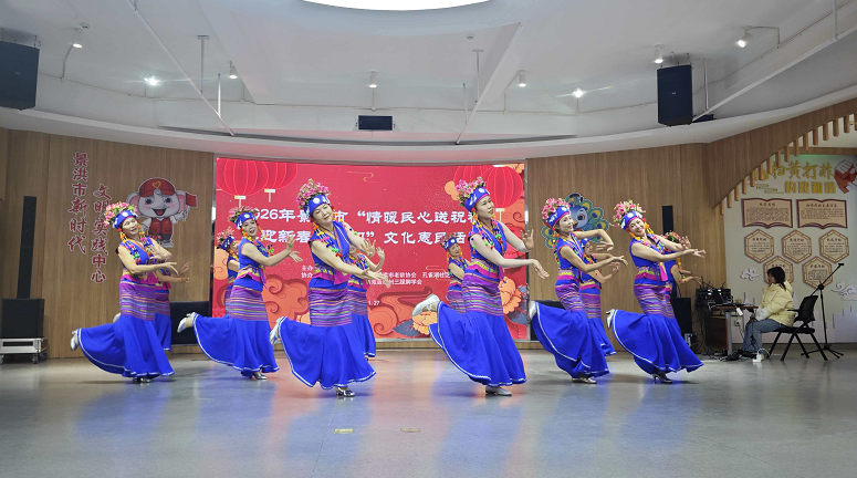 银龄文化志愿者走进景洪市新时代文明实践中心,开展“情暖民心送祝福 喜迎新春传文明”文化惠民活动。舞蹈《幸福山花》、《依拉贺》等精彩的文艺节目轮番上演,给居民带来一场极具民族特色与文化魅力的视听盛宴。“将新春祝福化作可触可感的文化交流,让居民在家门口就能享受到丰富多彩的文化生活,提升居民生活幸福感。”银龄文化志愿者杞琳说道。
