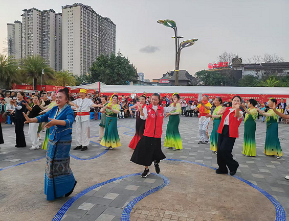 在泼水广场,西双版纳州老年大学文艺轻骑兵与心连心文化艺术爱心联盟云南省分会在泼水广场开启温暖而精彩的民族文化交流盛宴。通过广场舞互动展演与红歌大联唱,以舞会友、切磋技艺,用歌舞艺术传递情感,引导“新市民”共跳民族广场舞,以柔性服务稀释“异乡文化”浓度,搭建民族文化共融的桥梁,让民族艺术在交流中绽放光彩,文明新风在欢歌中浸润人心,凝聚了“民族团结一家亲”的共识。