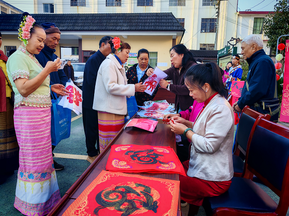 作为承载新春期许的国家级非遗,剪窗花是传统民俗的重要组成部分。活动特邀勐海县水务局退休干部党支部身怀剪纸技艺的老党员担任导师。现场,老党员化身传承人,从福字、元宝等基础造型,到祥马、锦鲤等新春特色图案,手把手带领居民勾勒裁剪。孩童与邻里围观学习,创作间隙,老党员结合自身经历分享民俗故事与党建初心,让红色精神与非遗文化在剪刀开合间相融。一张张红窗花凝结美好祝福,老党员以余热暖民心、以技艺传文化,既让剪纸非遗扎根社区,更让邻里情、党群情在互动中愈发浓厚,实现“银发添彩非遗,余热温暖社区”。