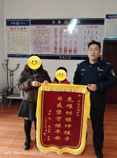 本网湖南讯(通讯员 龙嘉莉 唐江涓)3月2日上午,陈女士带着儿子专程来到湖南省邵阳县公安局河伯派出所,将一面印有“危难时候伸援手 日夜守护保平安”的锦旗送到民辅警手中,再三感谢派出所全力搜寻、帮助自己找回走失的孩子事情。
