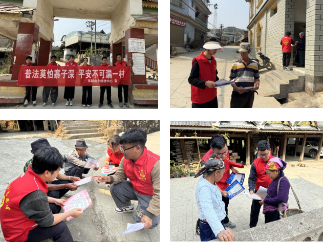 聚焦法治护航,普法宣传进村寨。青年志愿者围绕国家安全教育、打击跨境违法犯罪、防范电信诈骗等重点内容,通过案例讲解、发放普法手册、双语讲解等形式,深入村寨开展普法宣传,引导村民树立法治观念、增强法治意识。此外,志愿者还细致讲解用电安全、交通安全等注意事项,切实提高群众安全防范能力。此次活动累计发放各类宣传资料300余份,有效营造了“学法、守法、用法”的良好社会氛围。
