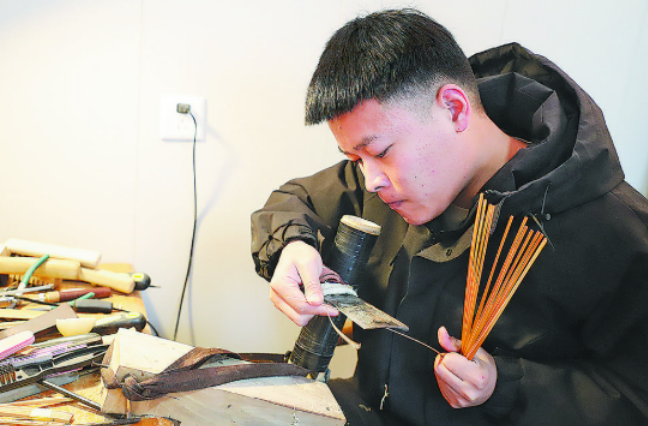 曹州折扇历史悠久,刘家制扇可追溯至百年前,第一代传承人曾远赴天津学艺,手艺代代相传。刘乃鹤7岁时便被爷爷手中翻飞的扇骨吸引,小小折扇开合之间尽显雅致神韵,传承的种子在他心底埋下。2020年大学毕业后,他正式接过家族手艺,白天工作,夜晚钻研,在长辈指点与自我摸索中,一步步叩开制扇技艺的大门。