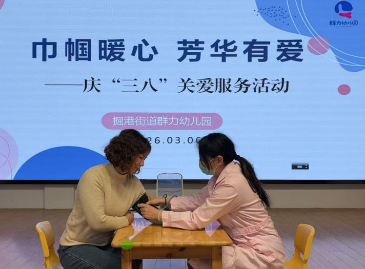 “巾帼暖心 芳华有爱”关爱服务。园内保健老师为教职工们测量血压、记录数据,提供个性化健康咨询和饮食、作息等建议,用贴心服务守护女职工身心健康。