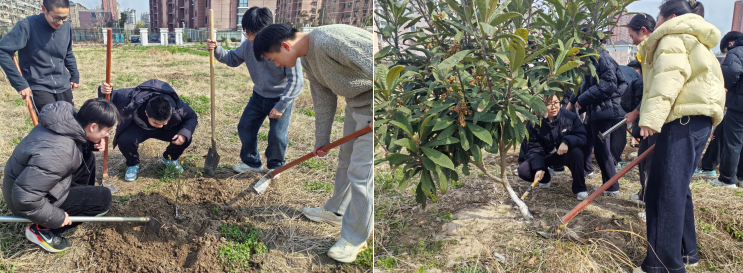 “是不是根部压着石板,根系没法伸展?”“低洼处土壤湿漉漉的,会不会积水烂根了?”“杂草长得比树还旺,肯定抢了养分!”“桃树叶子有虫眼,大概率是病虫害在作怪!” 从土壤质地、地势高低,到杂草竞争、品种特性,同学们不囿于表面现象,层层深入分析,大胆提出猜想,又在实地查验中小心求证。枇杷树为何根系发达?桃树病虫害该如何防治?新栽树苗如何实现百分百成活?一个个问题成为同学们思创实践的起点,在思辨与求证中,大家的科学探究能力与逻辑思维能力得到充分锤炼。