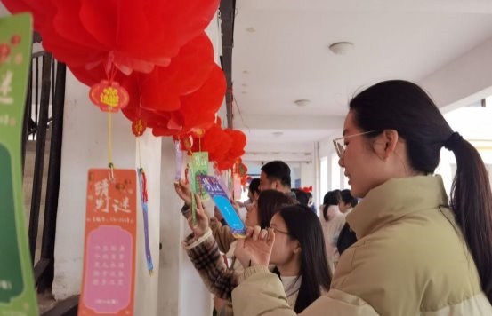 在猜灯谜活动现场,红彤彤的灯笼高高挂起,百余条五彩斑斓的灯谜纸条随风摇曳,将现场装扮得格外喜庆。谜面内容丰富多彩,涵盖了成语典故、生活常识、科普知识、党史人物以及廉政文化等多个方面,既具娱乐性,又具知识性。大家或三五成群互相讨论,或凝神静气独自思考,猜到谜底的人员则兴高采烈地排队与工作人员核对答案,领取精美的小礼品,现场欢声笑语不断,洋溢着浓浓的节日气息。