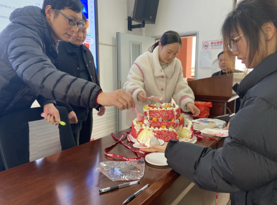 随后,工会孟主席主持生日核心环节,带领全场齐声唱响《生日快乐歌》,熟悉的旋律在校园里回荡。烛光摇曳中,五位寿星教师双手合十许下心愿,在众人的掌声与欢呼声中共同吹灭蜡烛,现场温情满满。甜蜜的蛋糕被分送至每位老师手中,一口香甜融化心间,笑容在每位教师脸上绽放。