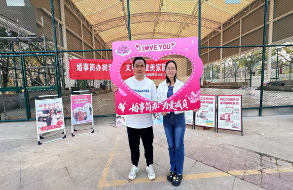 活动现场,党员志愿者精心布置的“婚事简办·为爱减负”拍照墙凭借清新设计成为居民争相打卡的热门点位。各族群众携家人、邻里驻足合影,用手机记录文明瞬间,通过社交媒体主动传播新风尚,让“婚事简办”从口号变为可视化的生活态度。