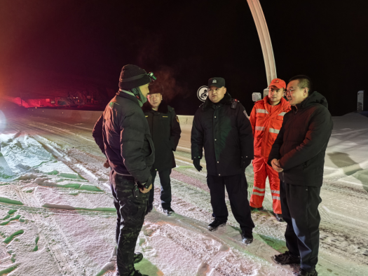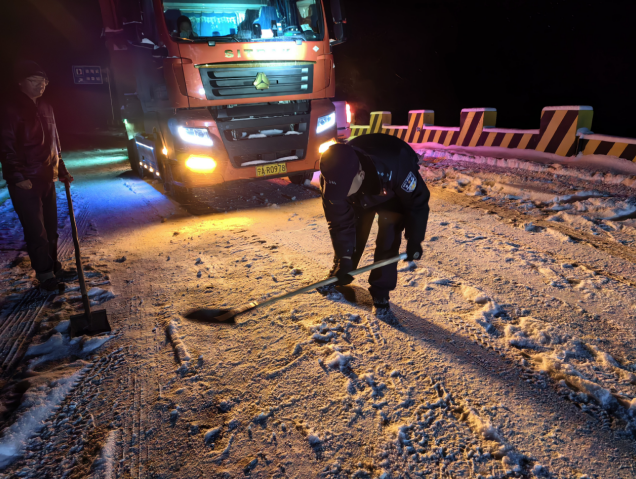 面对如此复杂的救援局面,现场民警深知,单靠派出所一己之力难以快速有效处置。他们第一时间将现场情况上报至县局情指中心。情指中心迅速启动应急联动机制,一张多部门协同作战的救援网络迅速铺开,县应急管理局、公路管理等部门同步收到指令,专业救援力量火速向事发地点集结。在等待增援的同时,派出所民辅警一边安抚被困司机的情绪,一边顶着刺骨的寒风,用铁锹清理车轮周围的积雪和冰层,为后续救援争取宝贵时间。