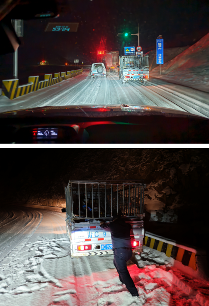 抵达现场后,民警发现情况远比预想的更为严峻。一辆重型半挂车横亘在坡道中央,车身已被厚厚的积雪覆盖,车轮在冰面上空转打滑,丝毫无法动弹。车上的400余只羊在风雪中瑟瑟发抖,发出阵阵哀鸣。司机站在车旁,满脸焦虑,几近绝望。