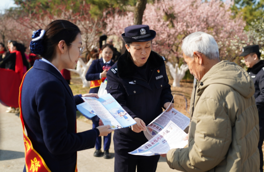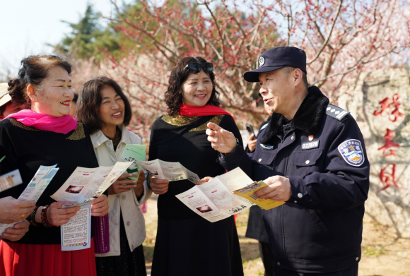 青岛市公安局李沧分局民警因地制宜,将宣传阵地搬进梅林花海,采取“见缝插针”的流动宣讲方式,趁着游客购票、观景、休憩的间隙,主动靠前、贴心宣讲。把生硬的法律条文、安全常识,转化为接地气、记得牢的温馨提示,让安全宣传融入赏花全过程,不扰雅兴、效果十足。