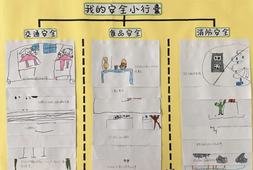 创意绘安全,让安全意识扎根童心。普法课结束后,各班教师结合课程内容深化安全知识讲解,引导幼儿主动分享对法治安全的理解与认知。孩子们化身 “小小创意家”,拿起画笔勾勒心中的安全世界,警察守护校园、遵守交通规则等一幅幅充满童真的画作跃然纸上;同时,孩子们还在老师的指导下,通过思维导图梳理交通安全、消防安全、食品安全等各类安全知识点,制作专属 “安全小行囊”。抽象的安全知识通过画笔与导图变得具象可感,深深扎根在孩子们的心底。